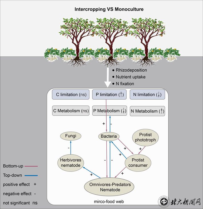 土壤生物多样性和生态系统功能的相互作用是目前生态学研究的热点。紫色土生态系统具有可利用性资源低,养分周转速率慢和食物网结构简单等特点,这导致紫色土地下生态系统的稳定性更加依赖于生物多样性和生物间的相互作用。本研究从土壤微养分限制的角度出发,豆科作物间作通过介导微食物网的上行效应(资源控制效应)和下行效应(捕食效应),最终导致紫色土农林复合生态系统生态功能发生改变。